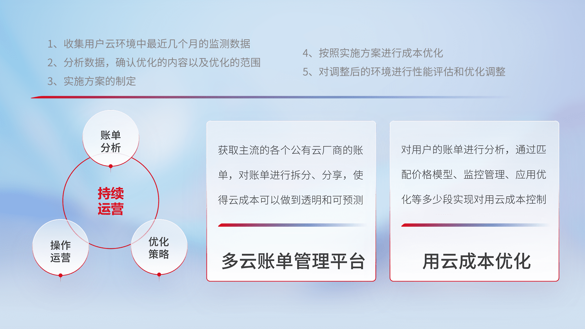 通过多云纳管,,,,以统一的资源数据模型把客户的云资源进行抽象和封装,,,,进而实现对多云资源的统一操作,,,,保障云资源管理的可靠性、、稳定性与可用性。。量身定制化运维内容,,,配置、、、、开发运维、、、、补丁管理、、、备份、、监控、、、、认证和访问管理、、审计和日常巡检等,,,保障在用云过程中的可靠度,,,,稳定度以及高可用率。。。